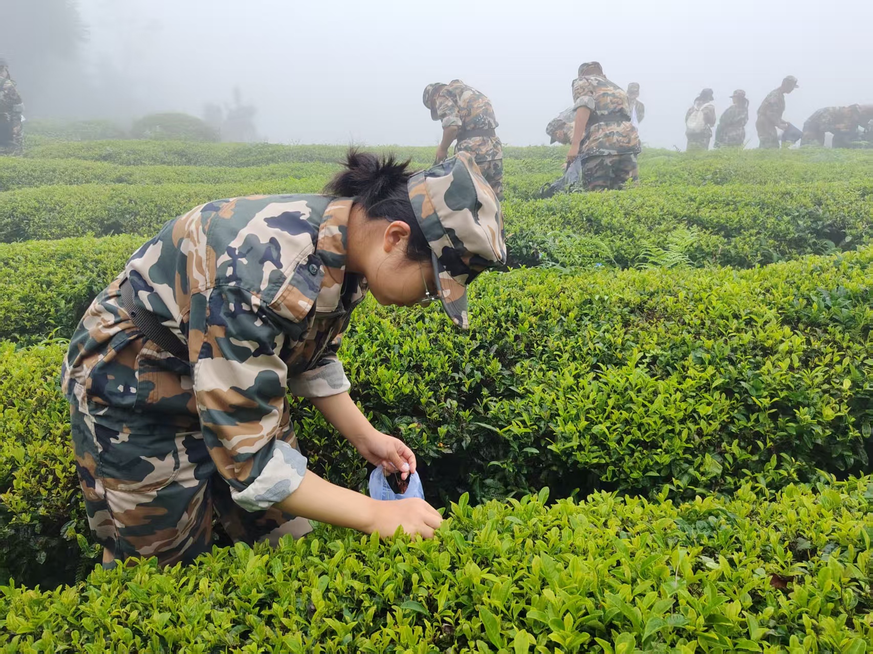 智能建造学院2025级新生颜煜辰说:“军训教会我们坚韧与纪律,而采茶让我们懂得,每一分收获都源于土地的滋养与人力的耕耘。”